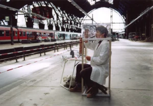 Pia Linz is painting a cube picture in the main trainstation of Frankfurt, 1997