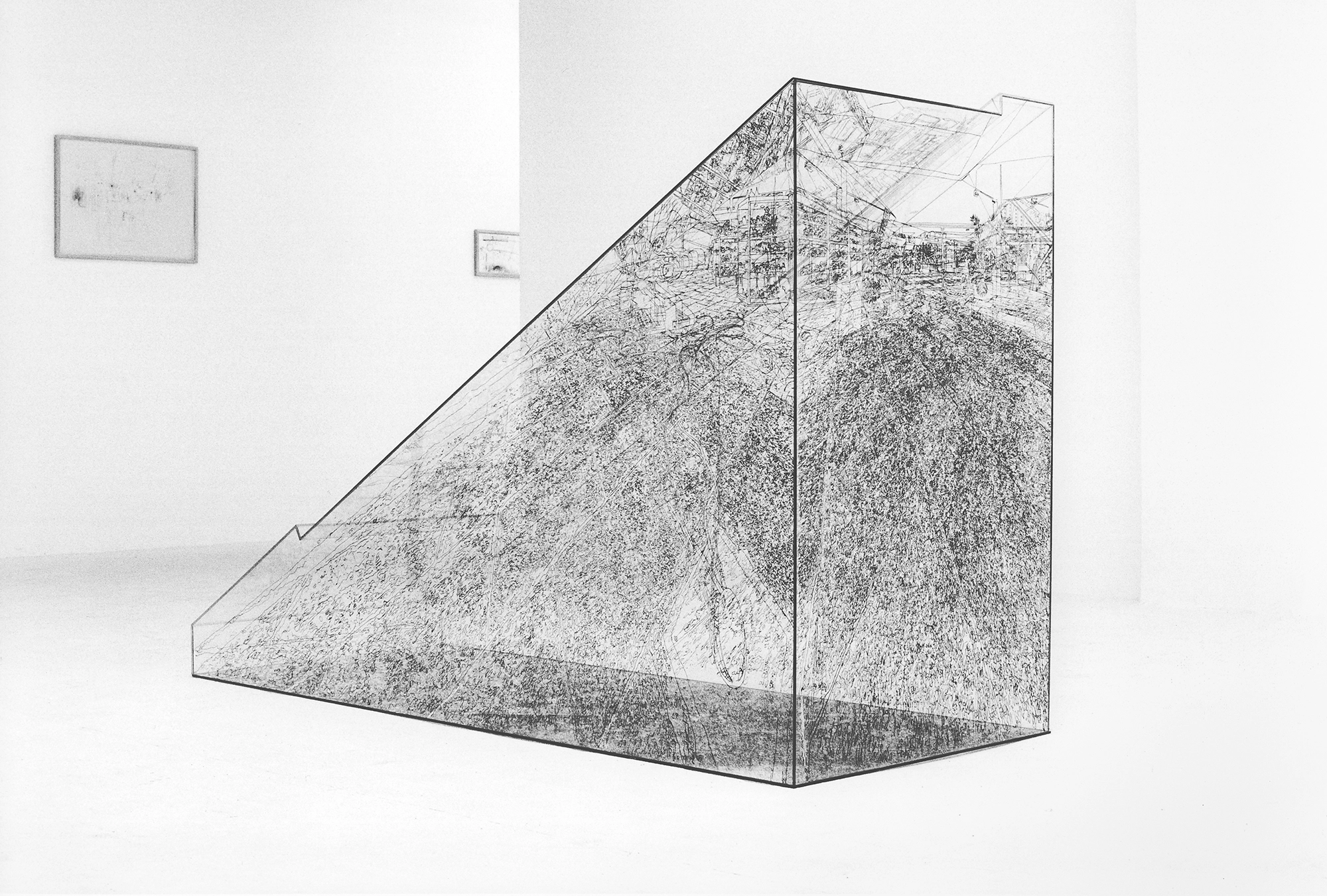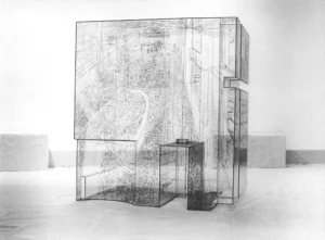 Pia Linz working on the drawing for the Box Engraving: TV-Tower (Alexanderplatz), under the staircase, 2004